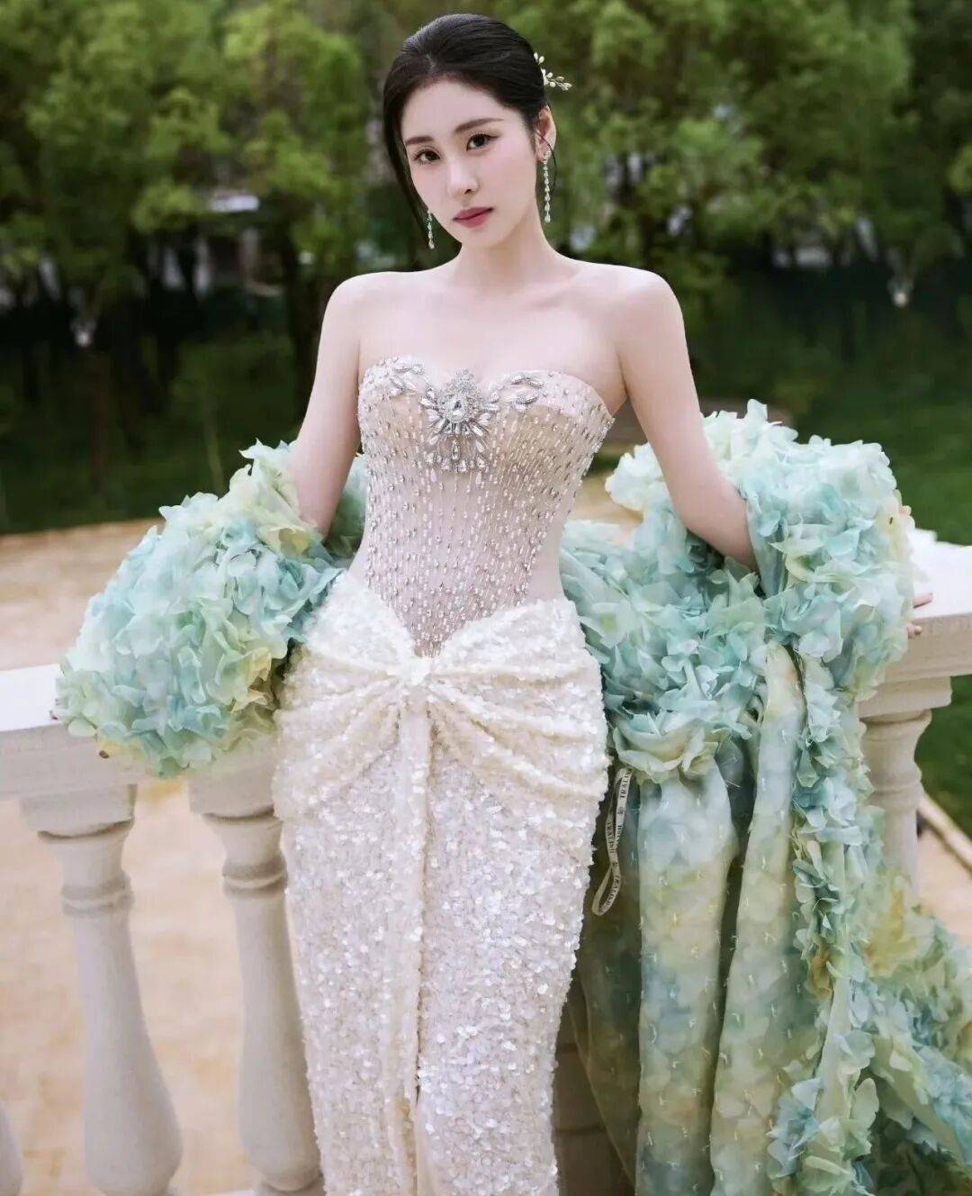 不光是华丽礼服,她穿起复古风也照样能打。之前那组波点抹胸鱼尾裙的写真,浅米色裙身配黑色波点,瞬间把人拉回老上海的黄金年代。她坐在复古梳妆台前,手里拿着铜镜的样子,就像从油画里走出来的民国名媛。贴身的剪裁把她的S曲线勾勒得恰到好处,168cm的身高配上45kg左右的体重,这身材比例说是“行走的衣架子”一点不为过。